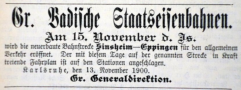 Am 15. November 1900, vor 125 Jahren, wurde die Elsenztalbahn von Eppingen über Steinsfurt nach Sinsheim eröffnet. Damit wurde Eppingen an die Zentren Heidelberg und Mannheim und an das überregionale Eisenbahnnetz angebunden.